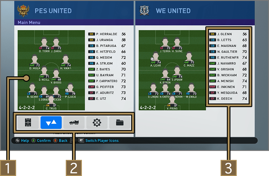 , um Ihre Startelf automatisch nach Spielerfähigkeiten auszuwählen. - Der „Team-Anführer“ ist der Controller, mit dem die Strategie bearbeitet werden kann. Der Controller mit der geringsten Nummer eines Teams wird zum Team-Anführer. (Der andere Controller kann nur zum Anführer werden, wenn während einer Partie im Pausenmenü die Strategie aufgerufen wird.) .