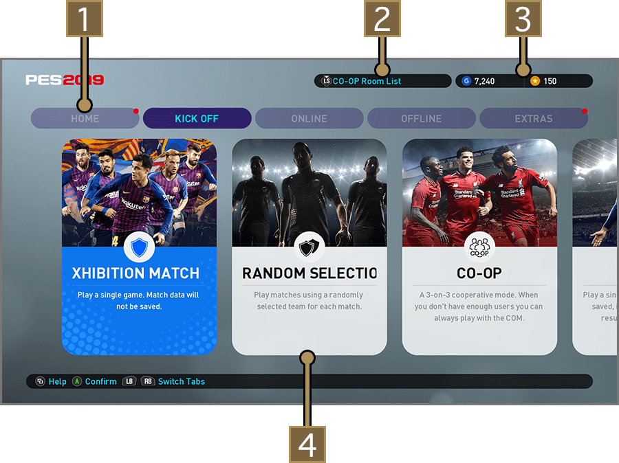 Le menu Coup d’envoi vous permet d’accéder à différents types de matches, ainsi qu’à une zone d’entraînement et d’apprentissage de nouvelles techniques. Connectez-vous au serveur pour affronter d’autres utilisateurs en ligne.